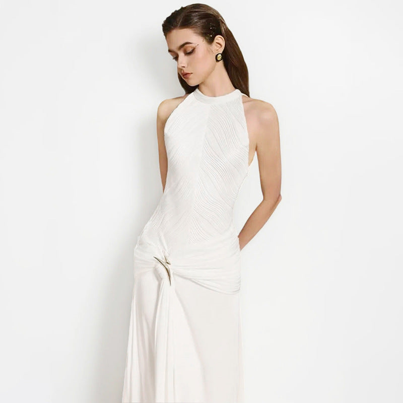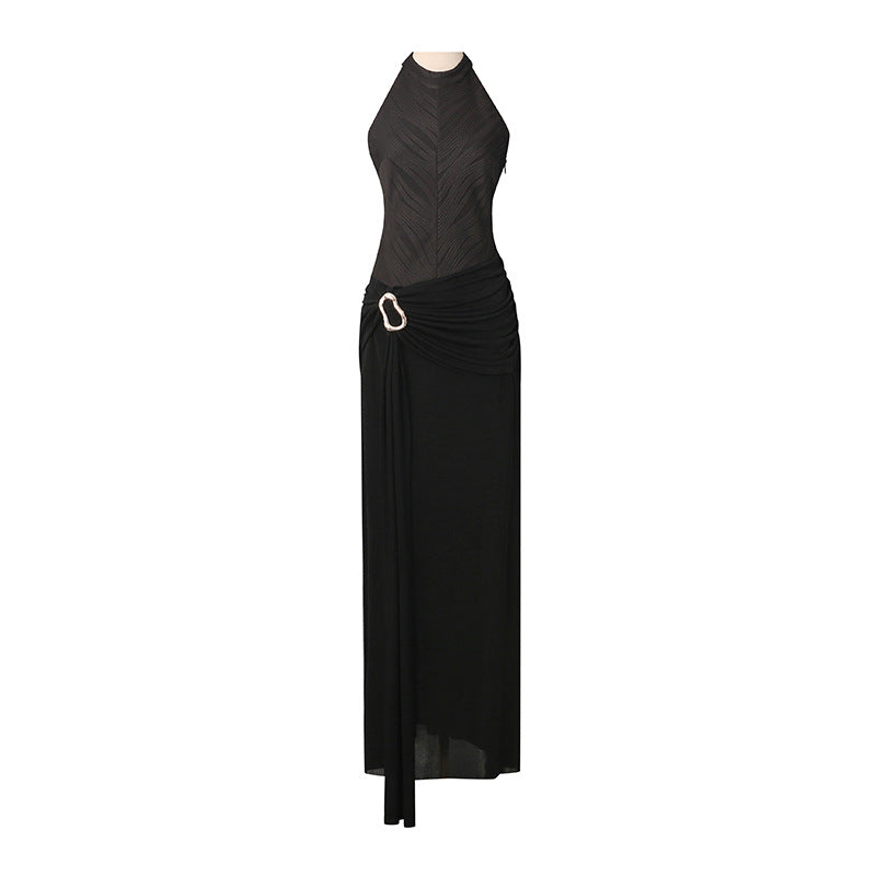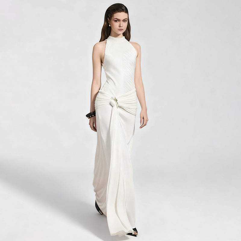 This elegant bodycon dress features a high-waisted design with twisted details, perfect for formal events or evening wear. The sleeveless style and long skirt create a sleek silhouette that enhances your elegance.