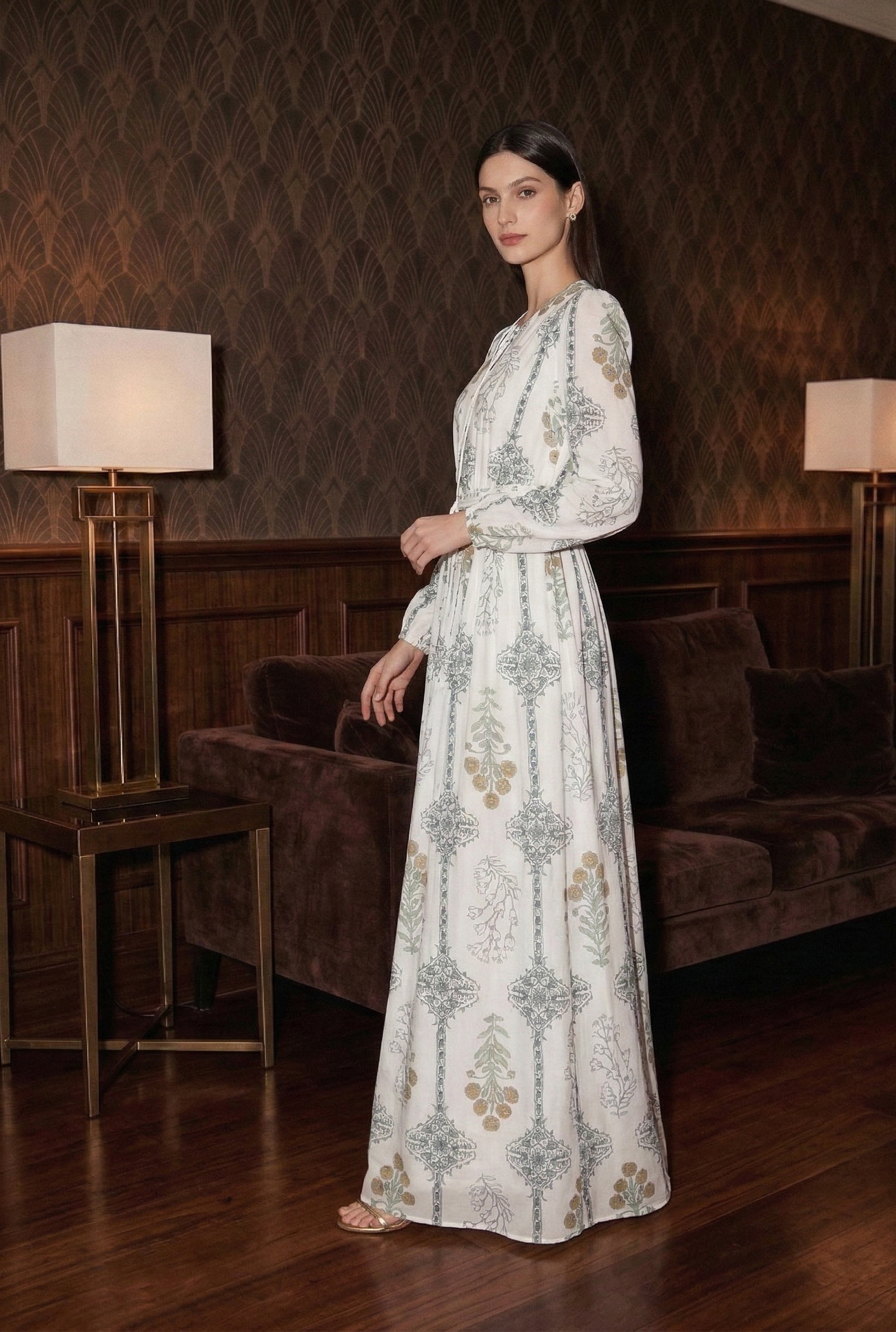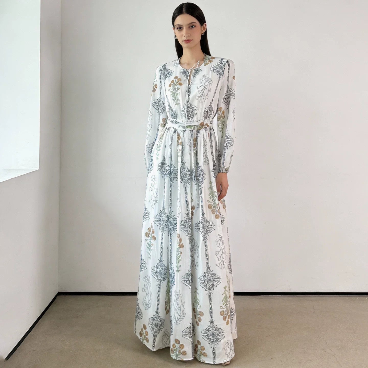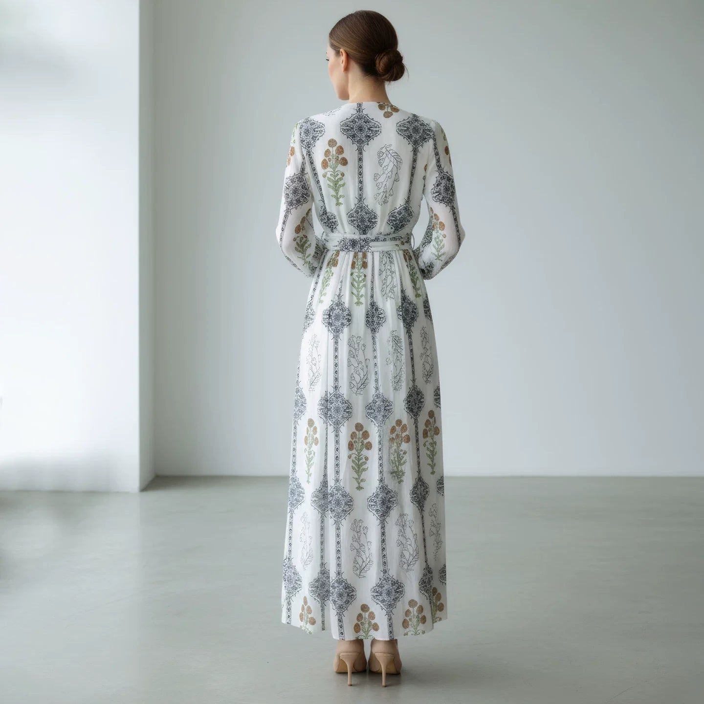 Gaun panjang yang elegan ini menampilkan cetakan bunga yang canggih dan siluet yang mengalir, sempurna untuk liburan pantai atau mengabadikan momen indah. Detail tali dan desain berlubang menambah sentuhan pesona pada pakaian serbaguna ini.